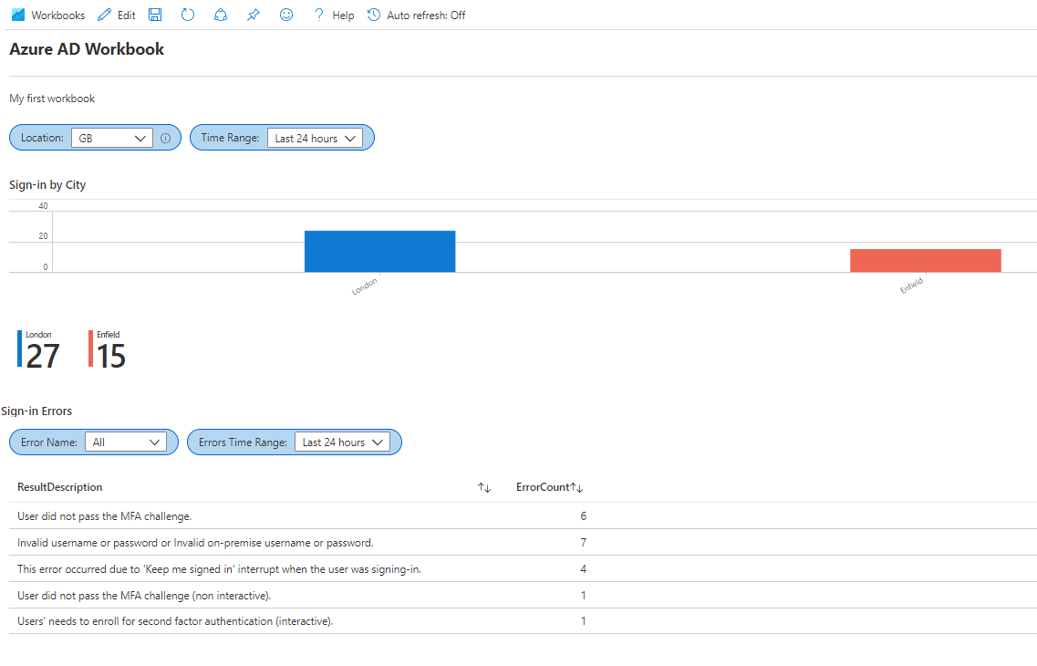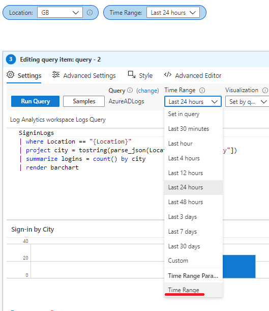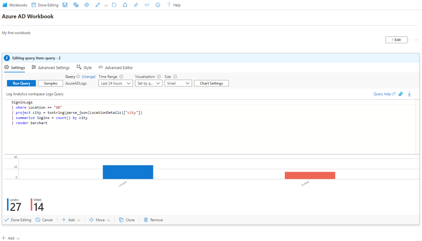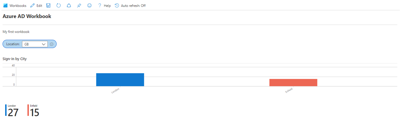 Edit the sample query and replace it with the following KQL which will show us a chart for all sign-ins from GB, detailing the number of sign-ins per city. Change GB to match your current location.
