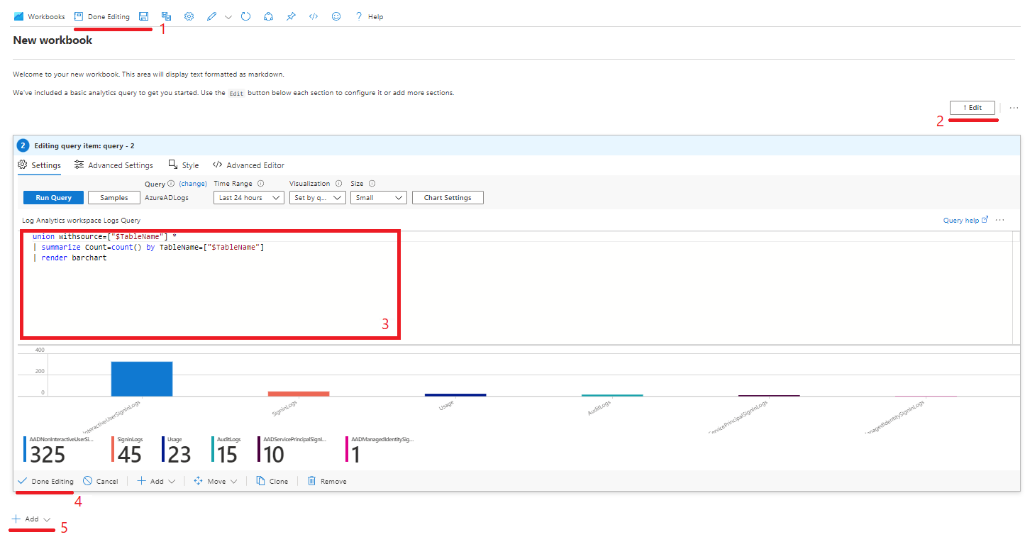 You should be presented with a new workbook which has a sample text followed by a sample query. Each of the blocks can be edited by clicking on their respective Edit buttons.