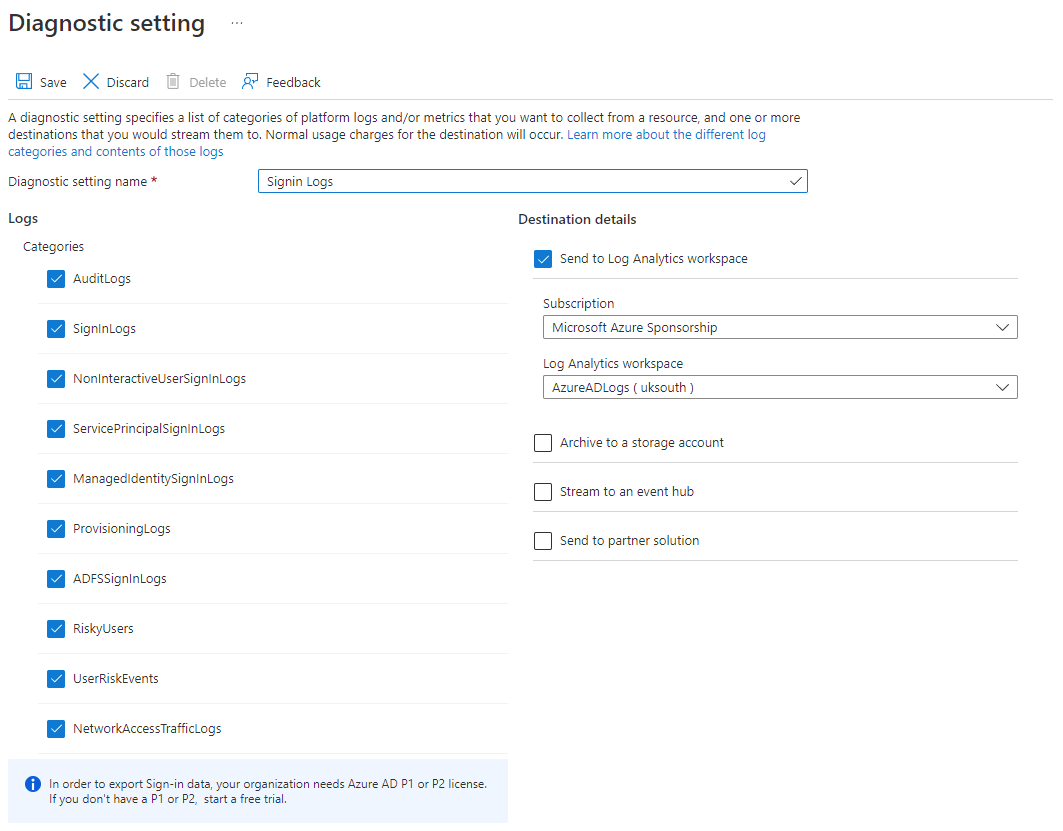 Once this step has completed, go to the service you wish to link, in this case Azure AD. Look for an item on the menu called Diagnostic settings and click on it. Next click Add diagnostic setting to configure the collection of data. You will notice the Diagnostic Settings screen appears on a lot of different services across Azure, if you want to configure a different service to redirect its logs to Log Analytics it is the same process.