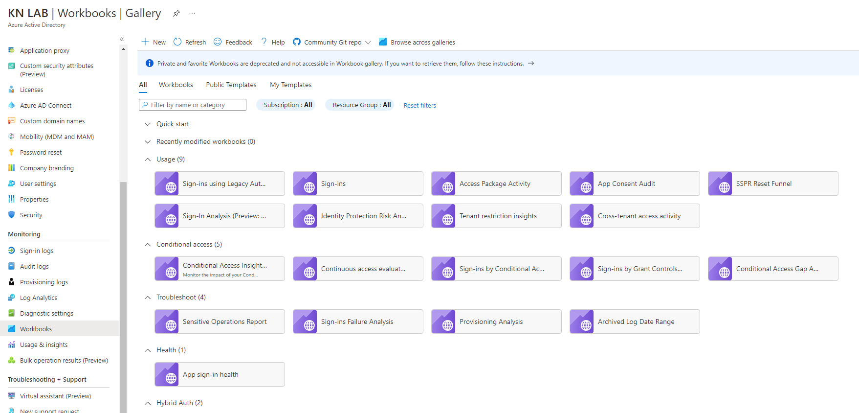 Azure AD has a good selection of built in workbooks which run off Log Analytics. Click on Workbooks on the left hand menu to access these. A selection of these is listed below. It may take a while before any data appears in your Log Analytics workbooks (generally up to 15 minutes) - you will only be seeing fresh data since you linked the data source to Log Analytics.