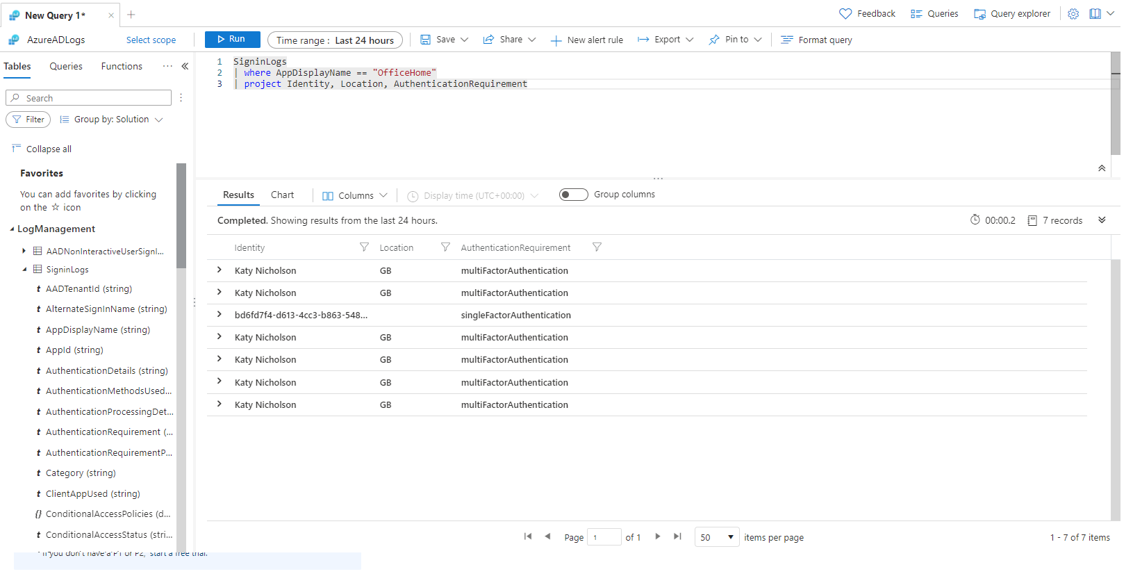 This will interrogate the SigninLogs table, and pull all rows where the AppDisplayName is "OfficeHome". It then projects just the Identity, Location and AuthenticationRequirement fields.