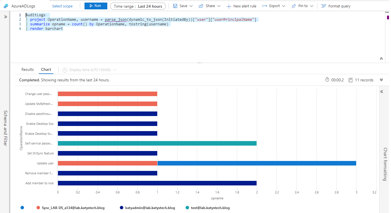 Another example query (although I wouldn't run this on anything other than a lab due to parse_json being resource intensive), this will output a bar chart showing the operation logged in the audit log (e.g. add member to role, Update user, Change password), the number of times it occurred and who initiated the operation.
