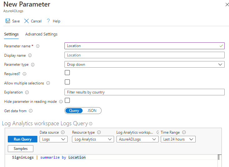 Hopefully you can now work your way around the Log Analytics workbook editor, so these next steps won't go into quite as much of a "click here, click here" level of detail. Edit the workbook again, and add a group item. In the group's Advanced Settings, set a title such as Sign-in Errors. Go back to the group Settings and add a new parameters item within the group, and create 2 parameters: