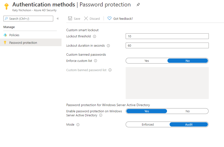 You'll notice there's an option for Mode - Enforced or Audit. This applies to Windows Server Active Directory only and you can't toggle the cloud user password protection on or off.