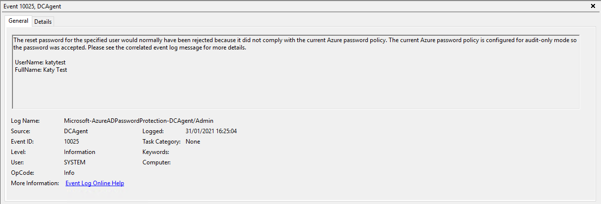A full list of event log entries associated with Azure AD Password Protection can be found in the Microsoft Docs.
