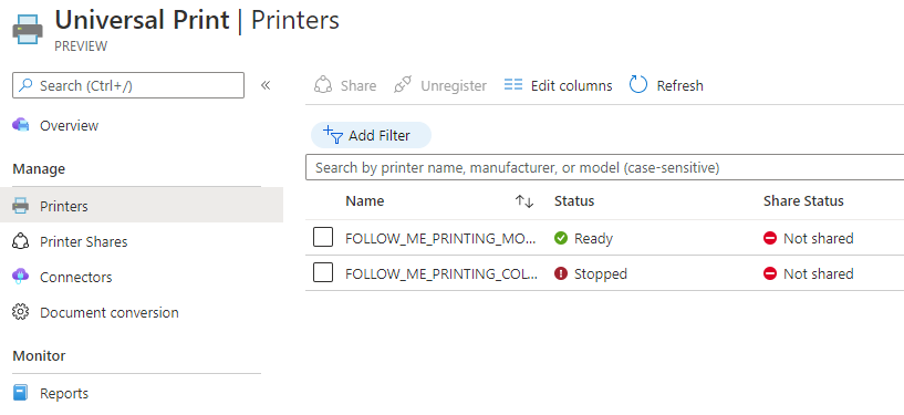 Go to the Azure portal and find Universal Print. You should now have a console where you can view your registered printers, the print shares, connectors and if you click through an individual printer you can manage the job log, sharing and permissions.