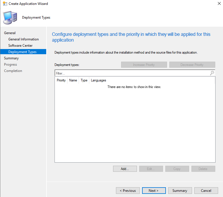 So our first step within Configuration Manager is to create a new Application (under Software Library). Follow through the wizard in the usual way - via MSI or as in my example, it'll be manual install as it's an EXE. Work through the flow as normal until you get to Deployment Types.