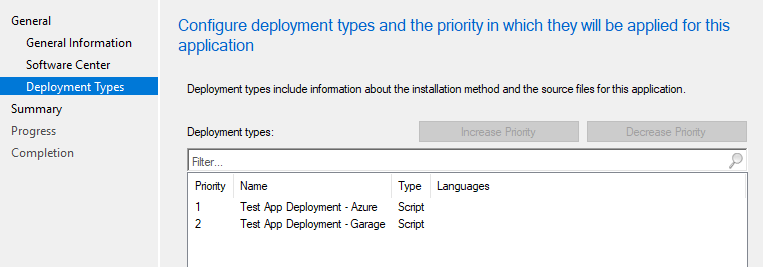 Once you've set that one up, you should be back at the Deployment Types screen, where you can create a copy the deployment type you just created - and then go in and edit the name, install parameters and requirements. So in my case, I clicked Copy, then renamed the copy from Azure to Garage, altered the install command line, and altered the OU targeted by the requirements.