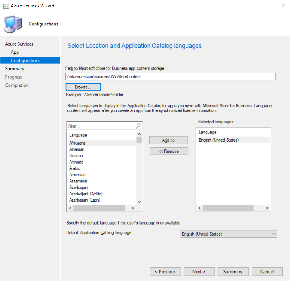 Now create a folder to store the synchronised content. I have a share called "sources" on my Config Mgr server for all the applications, drivers, scripts, OS images etc, so I've created a folder called WinStore. (Yes my server is still named SCCM, no it isn't worth renaming!). Select the languages you want, and finish the wizard.