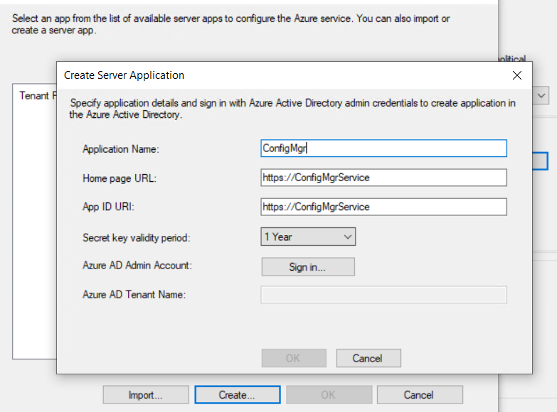 Enter the Application Name (I went with "ConfigMgr"), then click on Sign In and enter your Azure global admin credentials. This should connect and populate the Tenant Name box. Click on OK.