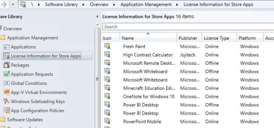 Next go to "Software Library\Application Management\Licence information for Store Apps", right click on the app you want to distribute and pick Create Application. Follow through the wizard and once done, go to Applications.