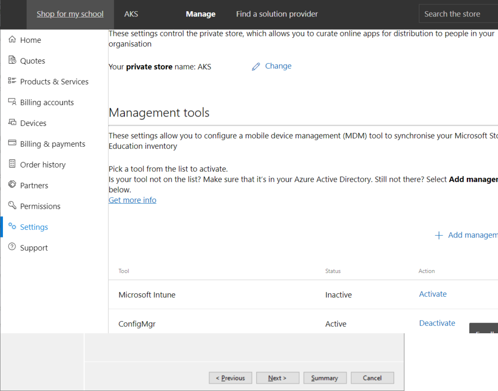 Go to the Business/Education store and log in as an account with admin rights, then go to Manage -> Settings -> Distribute. Add ConfigMgr (or whatever name you used in the first wizard) as a Management tool and click Activate.