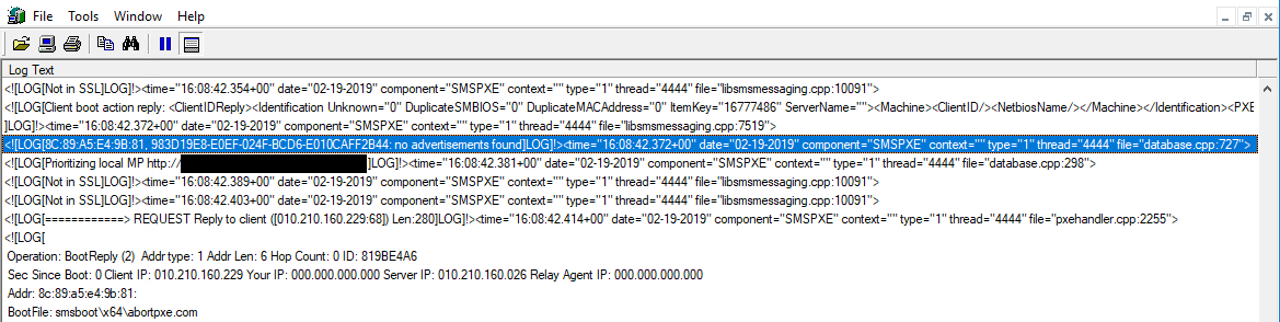 So my next step was to check smspxe.log on the SCCM server - this is in Program Files\Microsoft Configuration Manager\Logs\SMSPXE.log. If you've not already got it, cmtrace (formerly trace32) is a great way to look at these log files - on the latest version of SCCM it's in \\server\SMS_ It's showing that there are no advertisements - so nothing wrong with the PXE boot process itself, required more investigation. I then noticed that the GUID is similar but different to that shown on the PC, in that the numbers have been transposed in pairs - so what was 12345678 on the PC is suddenly 34127856 in SCCM. This transposed GUID happens to match another PC from the same batch.