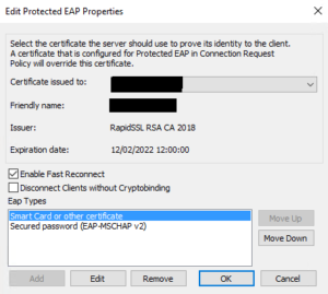 Next go to the Certificates tab, and add the certificate used by the NPS server. You can see what this is by opening NPS and going to Network Policies, then double-click the appropriate policy and go to the Constraints tab. Select "Microsoft: Protected EAP (PEAP)" and click Edit.
