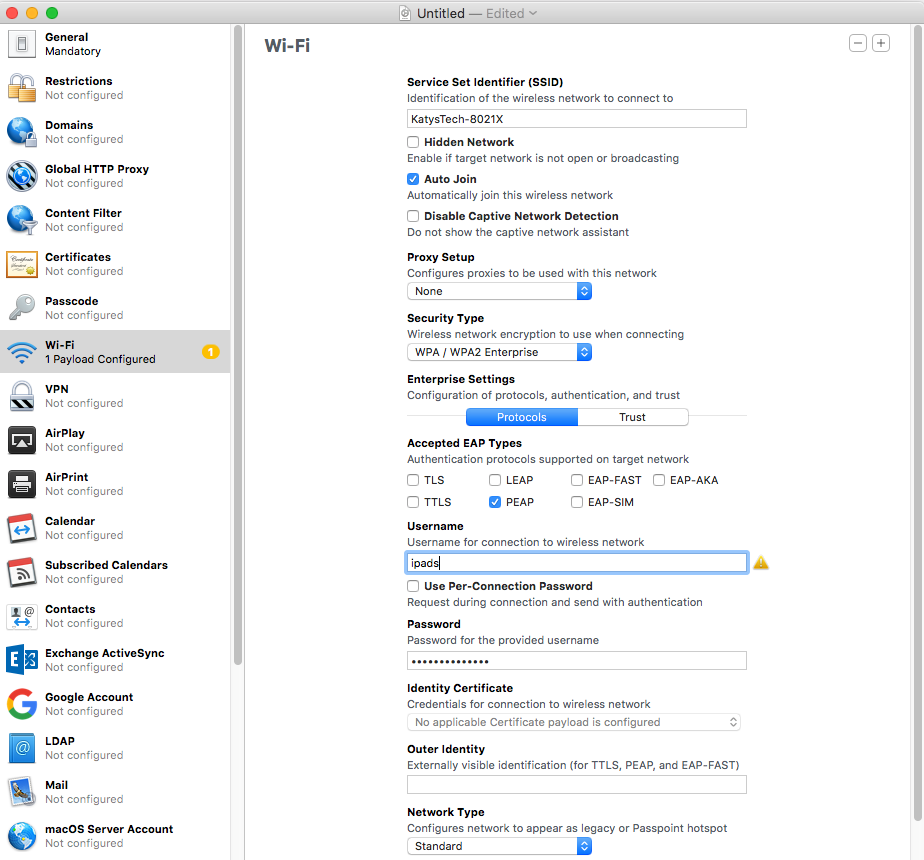 Now go to the WiFi tab and fill out the details - so in my case, the SSID, enabling Auto-Join and selecting WPA/WPA2 Enterprise as the security type. You'll then need to pick the Accepted EAP Type - for NPS it will be PEAP - and then on Certificates, tick the certificate you added earlier. If you skip adding the certificate and skip this step then the user will be prompted to trust the certificate when first connecting to the wireless network, which defeats the purpose of configuring it for them with a profile.