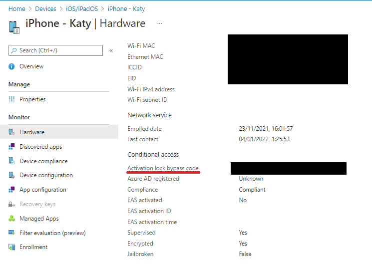 On Intune, you can view this data for a device by going to Devices > iOS/iPadOS and clicking on the device in question. Click on the 'Hardware' tab and scroll down to reveal the Activation lock bypass code.