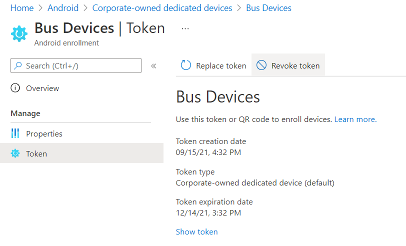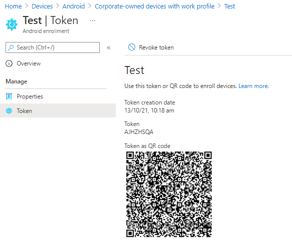 Click on the Corporate-owned dedicated devices button, and create a new profile. These profiles don't really have any settings, and the token can only be valid for up to 90 days. Run through the steps, picking "Corporate-owned dedicated device (default)" as the token type. Once this has completed you'll be able to click on the Token page, and if you then click Show Token you'll reveal a QR code. From this screen you can also revoke the token, or replace it when it's expired.