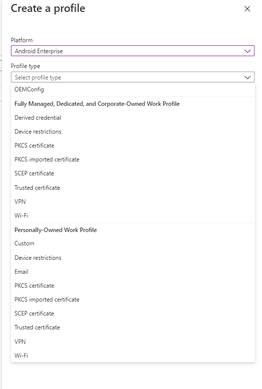To create a profile for your Android devices, go to Devices > Android > Configuration Profiles, then click Create profile. Select the Android Enterprise platform, then the type of profile you want to create.