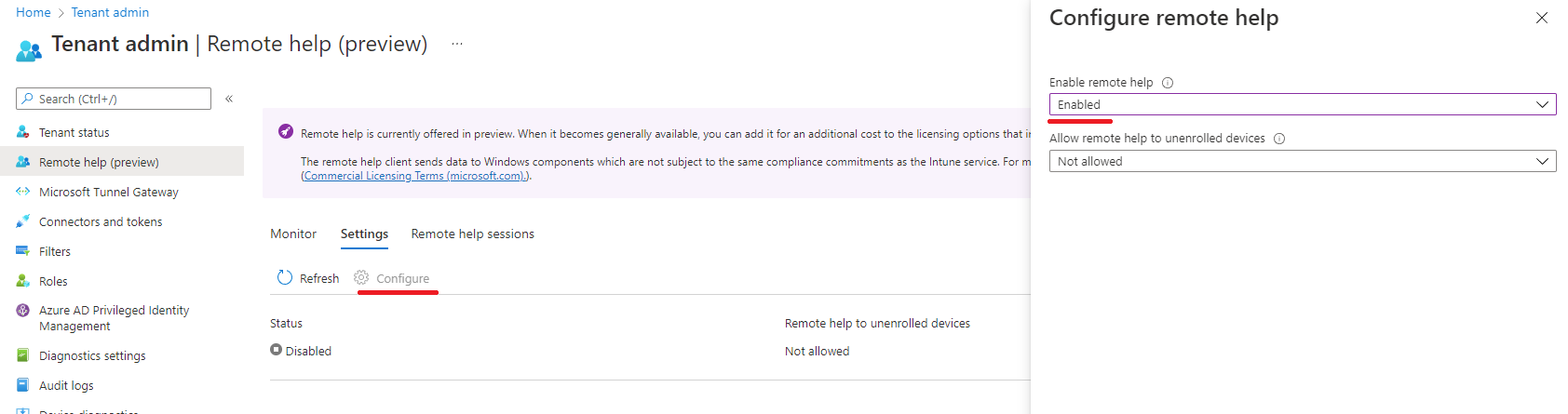 Before we can use Remote Help, we need to enable it. Go to MEM Admin Centre > Tenant admin > Remote help, click on Configure, then enable remote help.
