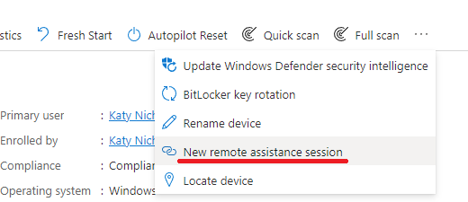 Initially you will need to make contact with the user, e.g. through your service desk or other support channels, and direct them to open the Remote Help application on their device, where they will be prompted to sign in with an organisational account. You then need to browse to their device within the MEM admin centre, and from the device's Overview screen click on the expand menu button, then New remote assistance session.