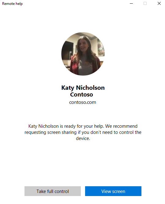 - The helper is asked if they want a view-only or full control session. If you connect in view-only you can't subsequently change to full control without quitting and starting a new session. The interface shows you the user's profile photo, name, the tenant name and the tenant's primary domain name.