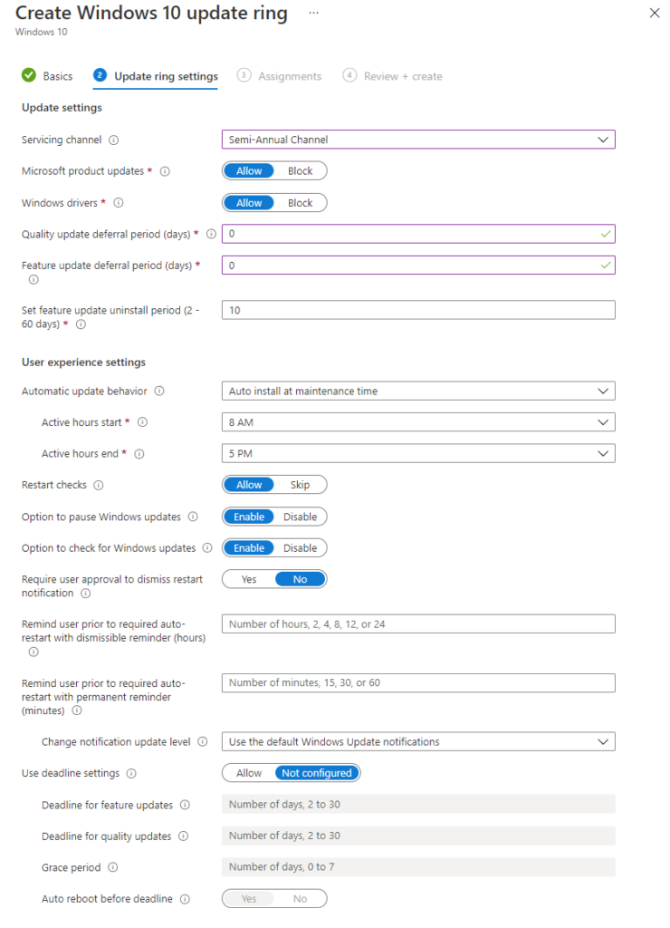 To configure the policies for Endpoint Manager, you'll need to go to Devices > Windows 10 update rings. You can create as many policies as you like, each targeting different groups. This way you can pilot updates on a small set of devices by giving them a 0 day update deferral, before they automatically update on other devices with a 2 or 5 day deferral, or whatever suits your environment.