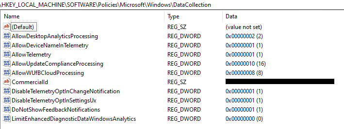 | Allow device name to be sent in Windows diagnostic data=Enabled | AllowDeviceNameInTelemetry=1 | Needed to show device names, otherwise they show as # |