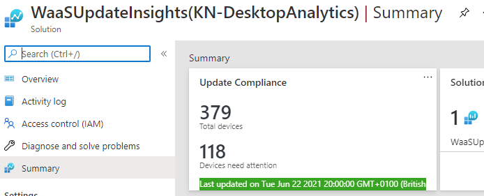 You can pin this to your Azure dashboard if you want, by clicking the pin button at the top right. Clicking on to the summary box will open the overview screen which should show you how many of your devices are up to date (or not). In my example I've caught it after Patch Tuesday but before the delay period for most devices has run out, so a lot showing as out of date.