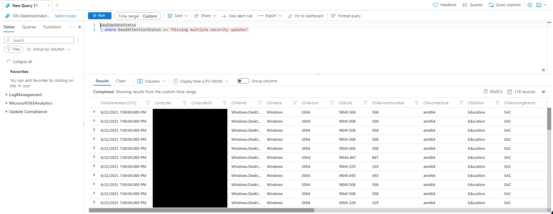 Clicking on some of the items will take you to a query window and show you the results in a table. This one's showing me which PCs are missing multiple security updates. While dropping back to the query view isn't as nice an interface as we had with WSUS, we can at least see the data (and if we wanted to look into the table data structure, we could write our own queries). The benefit of this data being stored in Log Analytics is that if we wanted we could write a custom workbook within Intune Reports to show the data we are really interested in.