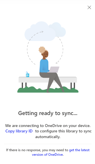 This will want you to provide the library name and library ID. To get the ID, go to the library you want to sync in SharePoint (so if it's in a Team, open the Team's files in SharePoint). Press Sync, then cancel the "Open in OneDrive" prompt, then click Copy library ID. The chances of this screen actually appearing seem to be notoriously hit or miss, but if you are logged in as a global or SharePoint admin it should appear. I'm logged in as a global admin and using Edge and it worked fine.