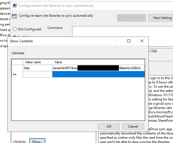 This script will grab the current user's UserPrincipalName and put together all the different parameters into an URL, and then runs onedrive if the library isn't already synced. If you've got multiple libraries you want to sync, with different combinations for different users, I'd probably recommend just having multiple scripts - one per library - and then linking the appropriate scripts to the appropriate GPO.