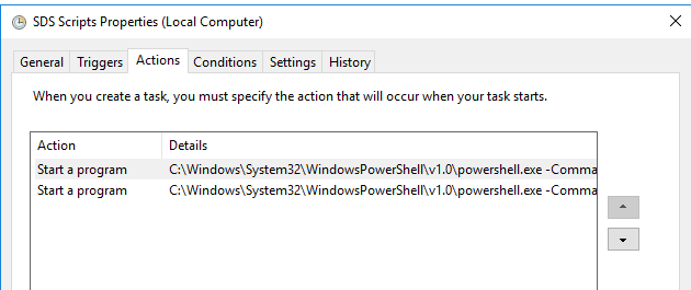 Give it a sensible name (e.g. SDS Scripts) and change the user it runs as to SYSTEM. Add a trigger of once daily at something like 10pm. Under Actions you will need to add as many rows as you have SDS profiles - so for me, two - Seniors and Prep: