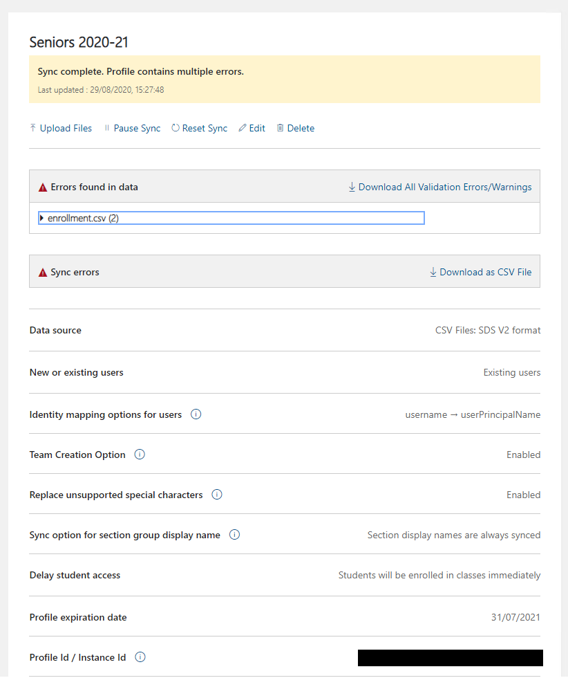 Once you've got it set up, it will process the CSV files and make the teams. Here it will tell you about any errors it finds. On my setup the only errors were due to a couple of students not having e-mail addresses in iSAMS. Note down the profile ID for each of your profiles.