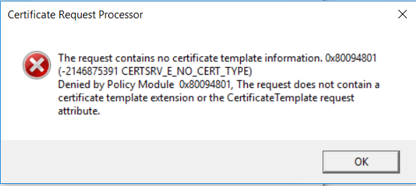 Unfortunately you can't just request a certificate from this template in the Certificate Authority snap-in - you'll get this error because the request does not include any template details: