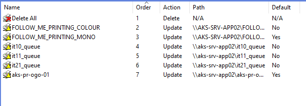 Set up your list of printers - it doesn't matter whether you select Create, Replace or Update as they all do the same thing in this instance. If you set multiple printers to be default, whichever runs last will win.