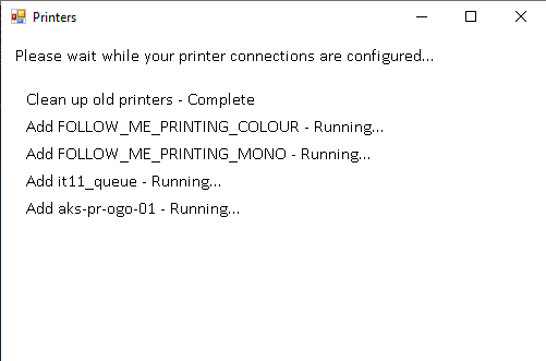 The issue being - roughly 5% of the time, on random user/computer combinations, printers would take a long time adding and then fail to add, with a non-specific error message. My first go at this was a basic powershell script which had a hard coded list of location/printer mapping, and it would run the "add printer" command repeatedly until the error went away. (It always added fine on the 2nd go). The problem with this is that it's a complicated script for technicians to update, and being a single threaded script the nice form it displays showing people what's happening would freeze while it was working in the background.