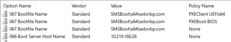 | PXEClient BIOS | Vendor Class = PXEClient (BIOS x86 & x64) | 067 Bootfile Name: SMSBoot\x64\wdsnbp.com |