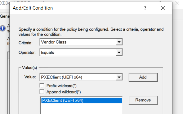 | PXEClient UEFIx64 | Vendor Class = PXECleint (UEFI x64) | 067 Bootfile Name: SMSBoot\x64\wdsnbp.com |