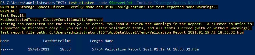 You can have a look at the validation report in Windows Admin Centre by going to the cluster Overview page and clicking on Validation reports. In my case the warnings were about not having any SSD drives present (which is fine if you're not intending on being very disk intensive - my production system has no SSD cache and works fine, although it's not used for heavy file serving as all that is stored in OneDrive and Teams) - and a load of warnings about SCSI enclosures and lack of support for SCSI Enclosure Services (SES).