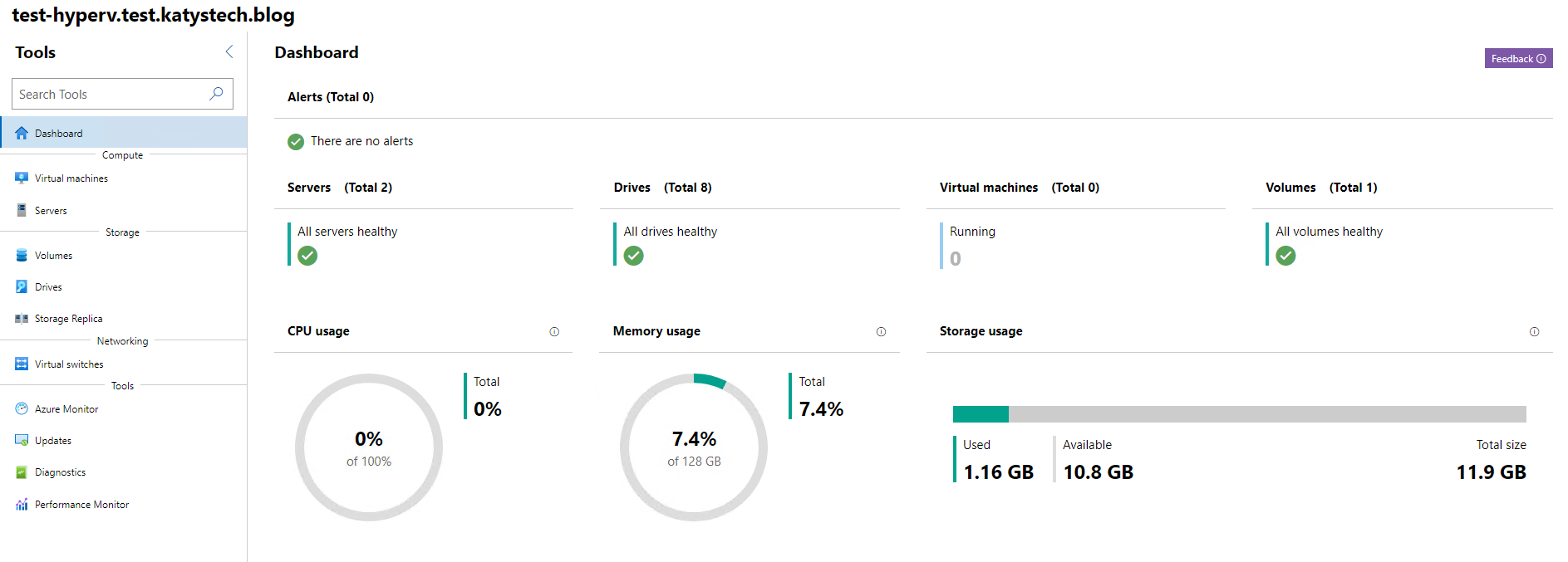 The next step is to re-load Windows Admin Centre so that it notices we've configured S2D - probably best to just close and re-load the browser. Once you're back in, click onto your cluster again and you should see a nice dashboard: