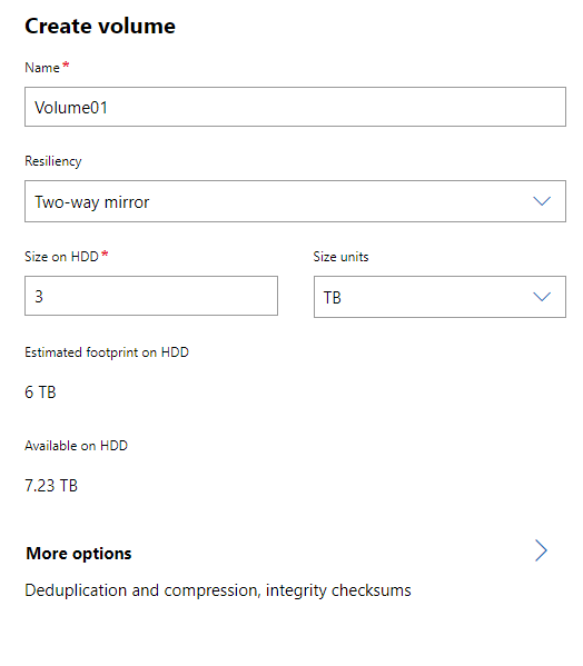 Click on Volumes on the left hand menu, then go to the Inventory tab. You should see a single volume already on there called ClusterPerformanceHistory. Click on Create to start making one to store our data. The level of resiliency available to us will depend on how many hosts we have in our cluster. As this is just a 2 node cluster all we can pick is a two-way mirror, which is fine. Don't be confused by the "Available on HDD" figure - this is the total available across all hosts, so I've had to create a 3TB volume to fit into the total 7.23TB available (3TB per host = 6TB out of 7.23TB total).