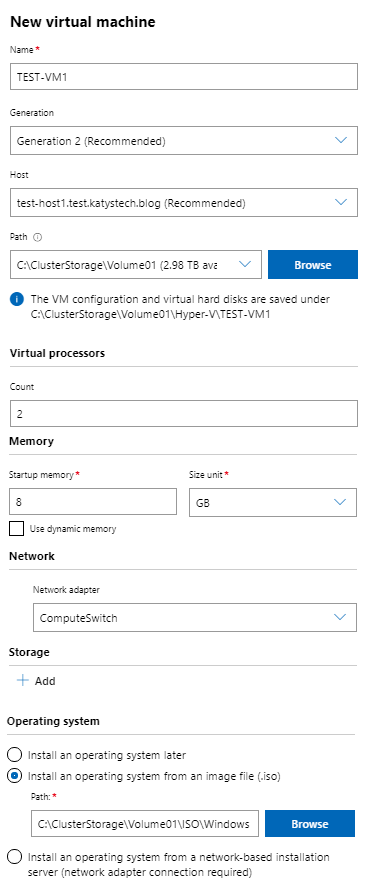 Now go to the Virtual Machines section on the left, and then click on Add then New. Fill out the desired configuration - make sure you select the correct path for the storage, i.e. C:\ClusterStorage\Volume01 - it's available from the drop down list so you don't need to browse for it. Add a network adapter on the Compute switch, create a disk and either mount the ISO we copied earlier, or select to boot from a network boot server, then click Create. If you're booting from a network server with a Generation 2 VM your boot server will need to support UEFI based network boot. With a Generation 1 VM you'd need a legacy network adapter installing onto the VM before it can boot.