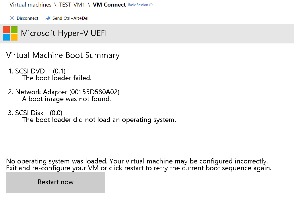 With the configuration I've used, once you start the VM you'll find a boot error message - because we can't start it, then connect, quick enough to see the "Press any key to boot from CD/DVD" message to launch Windows setup. Luckily there is a restart button that we can press to try again, failing that we can press Send Ctrl+Alt+Del to restart it.