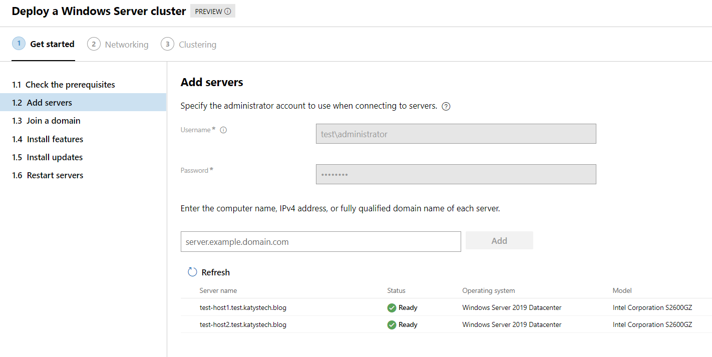 The next screen will ask us for credentials and server names to add the servers. Enter an administrator account and add your servers. It might take a while before it validates the servers but this is normal.