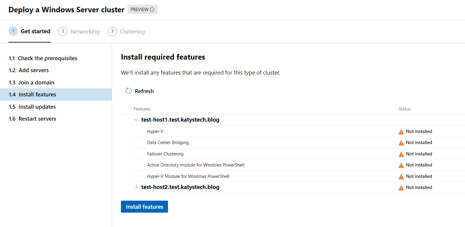 Now we'll get a screen showing us the required features and their installation status on each server. Click Install features to get going. Once it's all installed you should see lots of green ticks and the Next button will enable. Click it and move on to updates.