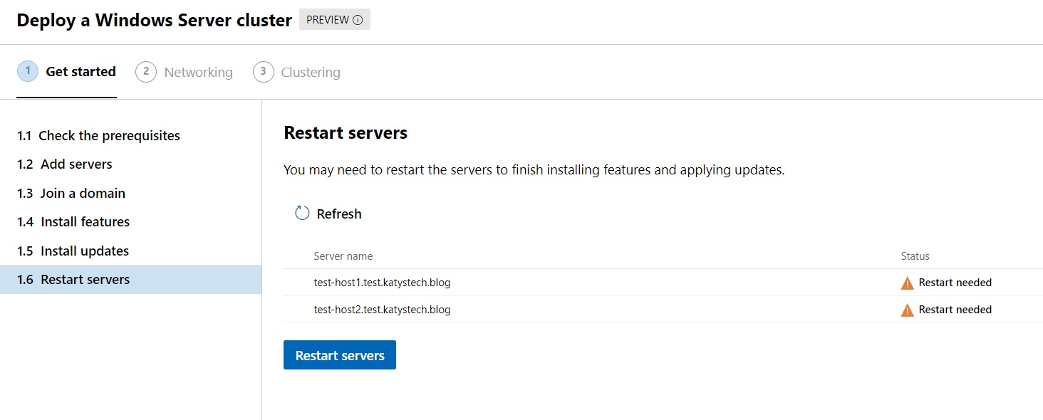Finally we arrive at the server reboot step! Click the button to restart your host servers. They restart a couple of times whilst configuring the roles and features so it may take a while if you have servers that spend ages thinking about things pre-boot.