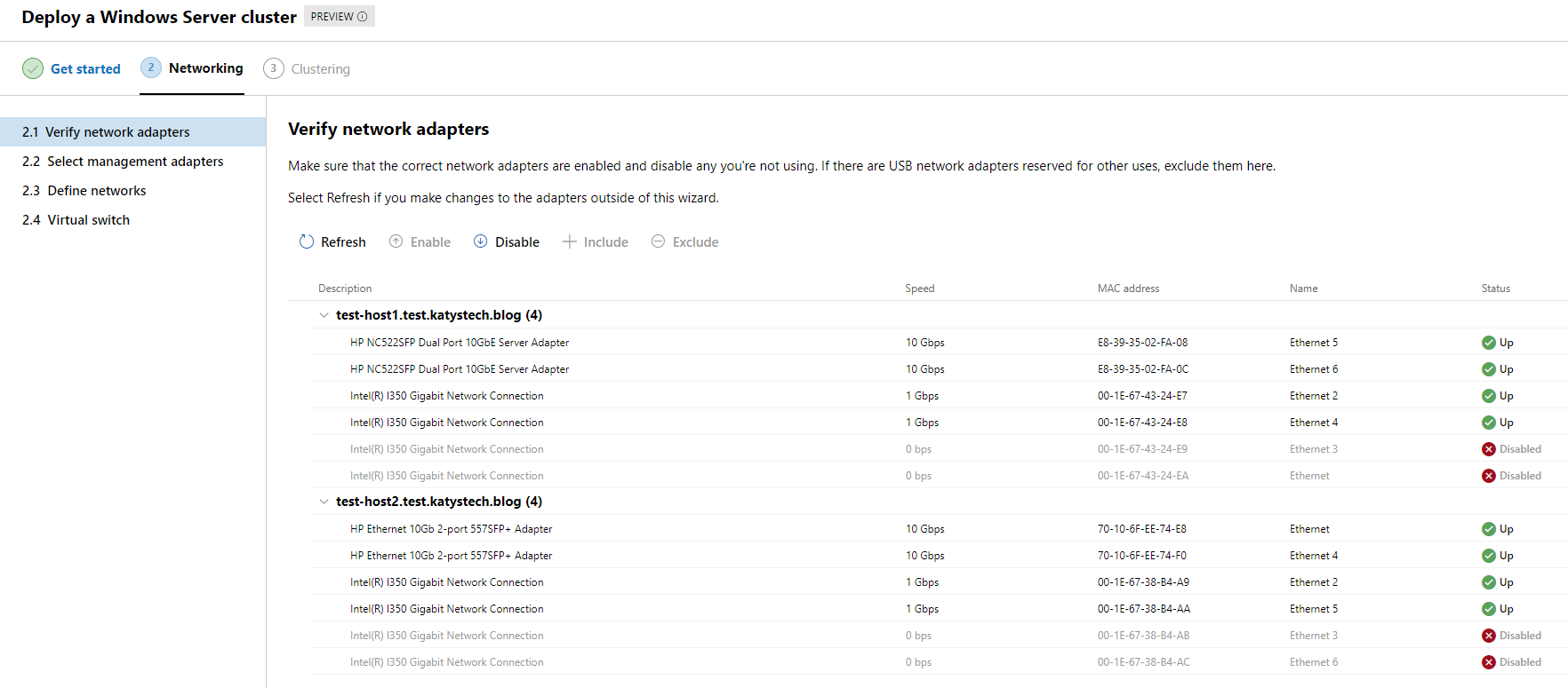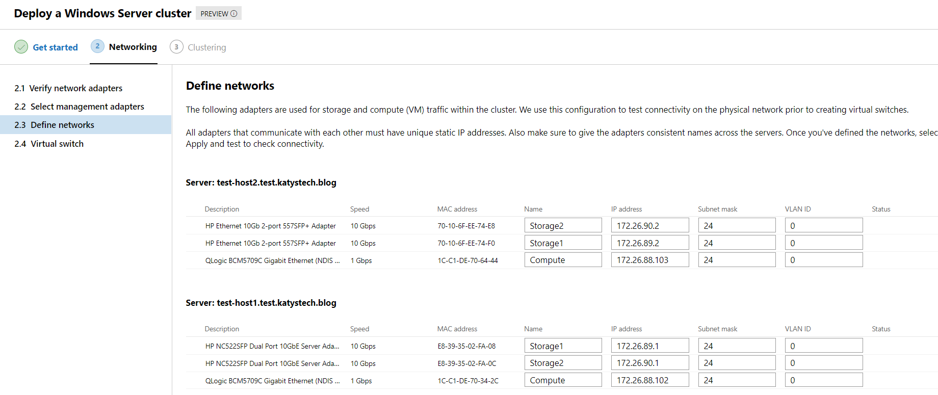 The wizard will now check the network adapters on each host - make sure they're all looking good as below. (In this test environment I've dropped a 10GbE network uplink for the Compute connection to 1GbE as I've not got enough spare 10GbE cards)