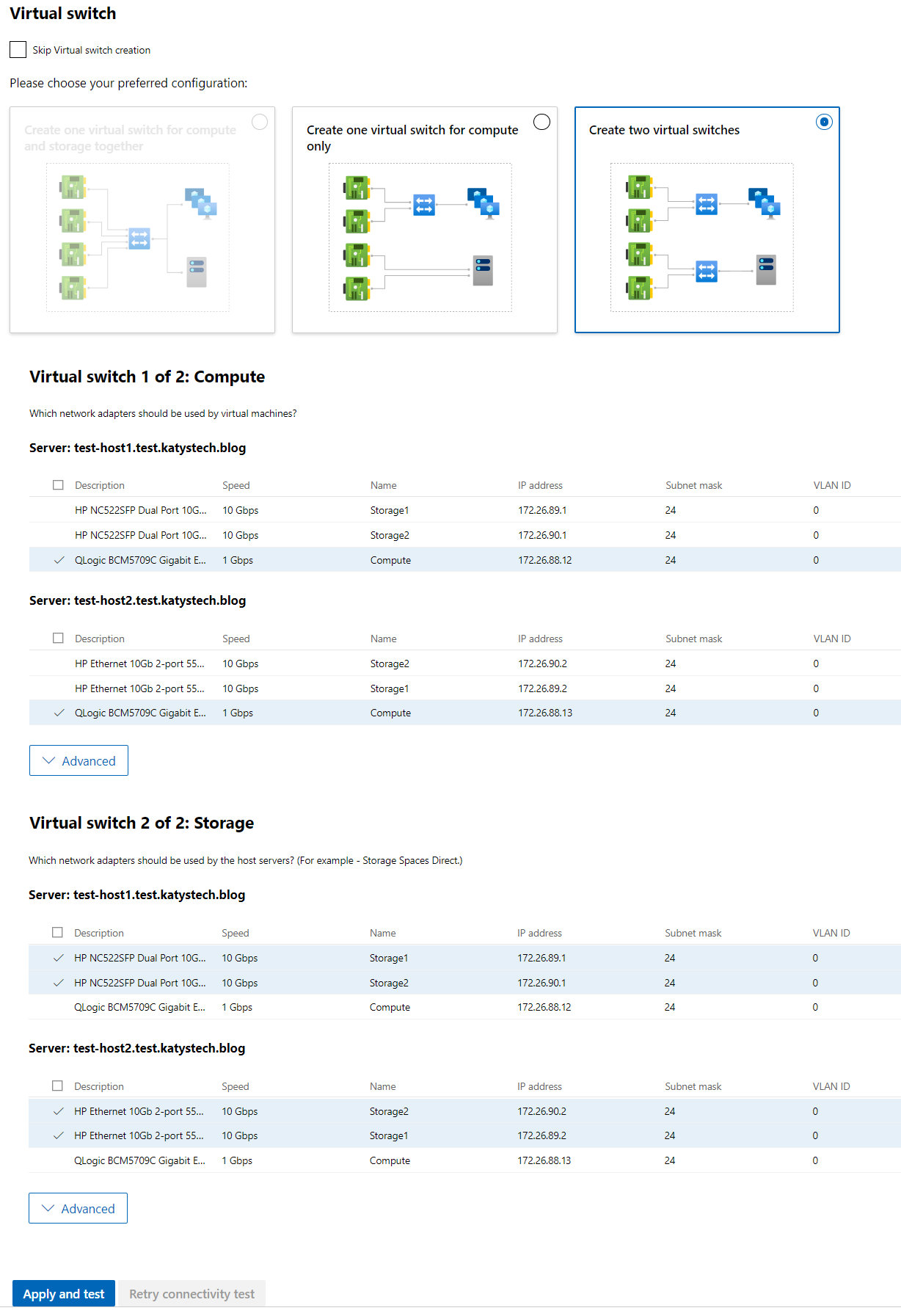 Now we need to define the Virtual Switches. In this configuration I use two switches - one for compute (i.e. the switch the Virtual Machines will use to talk to the network) and one for storage (i.e. for the two hosts to sync disk storage and other associated tasks). Scroll through the list ticking the Compute adapter on each host for the Compute switch, and both Storage adapters on each host for the Storage switch. Then click Apply and test.
