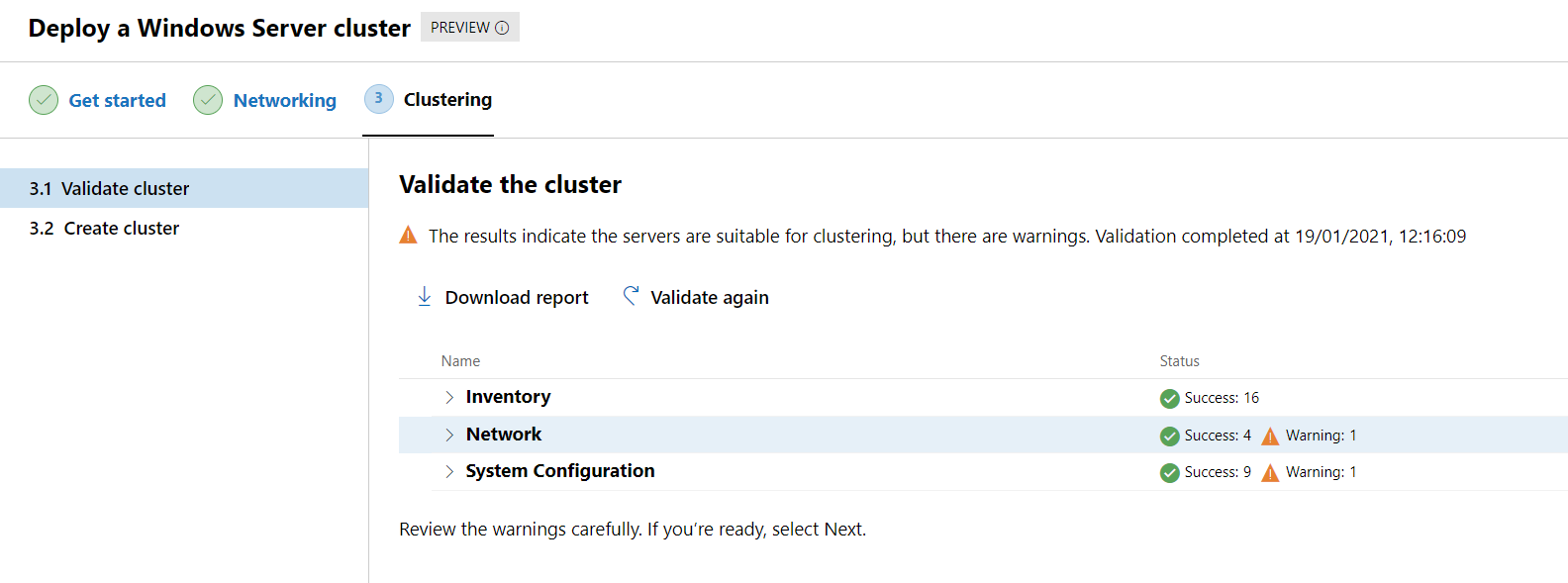 Slowly getting there - the last step is to validate and then create the cluster, so click on Validate. You'll probably be asked to enable CredSSP for this to work - so say Yes when prompted. This step takes several minutes to complete while it goes through a series of checks. Hopefully they will all show as Success, if there's any that haven't you can click Download report to find out why. When I did this I had a warning about IP configuration (no default gateway reachable - this is a lab setup so there isn't one) and a warning about system updates - it will tell you in the notifications area where it has saved the report. It's usually in %LocalAppData%\Temp on one of the host servers.