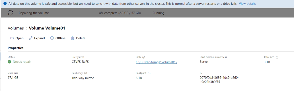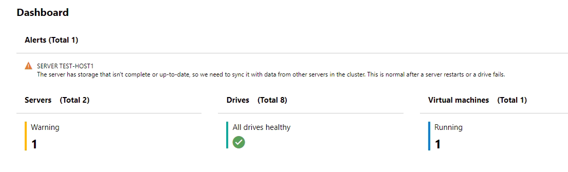 If a host suddenly loses power, the remaining host should stay running (worked out using the cluster quorum mentioned earlier) and anything that was running on the failed host will re-start on the remaining host (or if you've got more than 2 hosts, one of the remaining hosts). Once you've got the failed host back online just let it boot up and it will re-join the cluster. You'll then be told in Windows Admin Centre how far behind the volumes are and they will automatically resync for you.